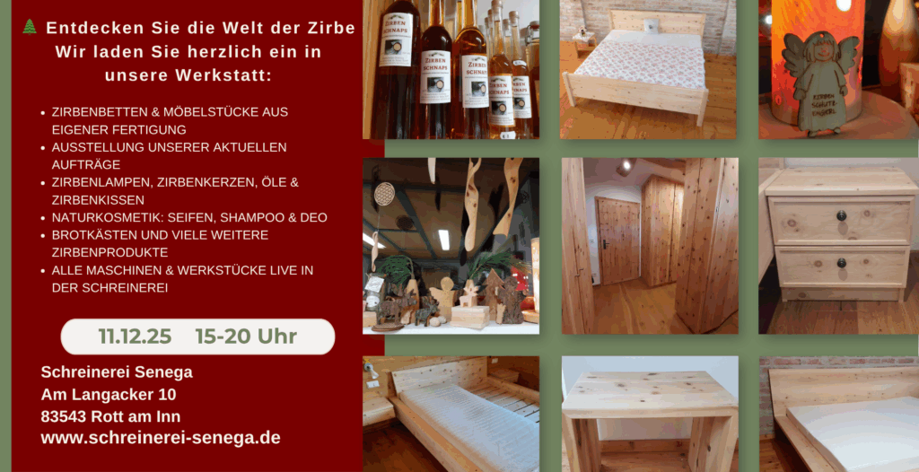 Wenn du beim Wohnen Wert auf Tradition oder individuelle Gestaltungsmöglichkeiten in Größe und Form legst, oder auf der Suche nach einem Zirbenholzspezialisten bist, dann bist du bei uns in der Schreinerei Senega in Rott am Inn im Landkreis Rosenheim im schönen Bayern genau richtig.